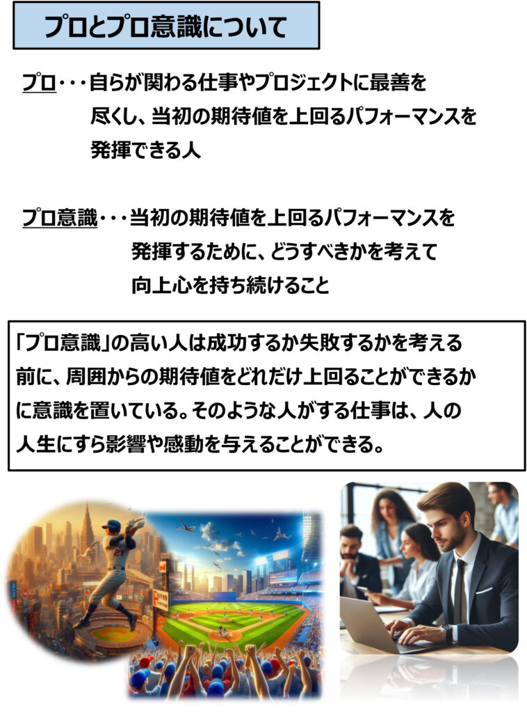 プロとは、自らが関わっている仕事やプロジェクトに最善を尽くし、当初の期待値を上回るパフォーマンスを発揮できる人のことです。そのためにどうするべきかを考えて向上心を持ち続けることがプロ意識です。