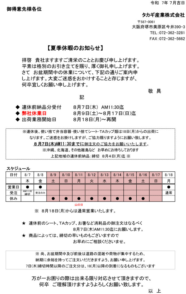 連休前納品分最終受付:8月7日(木)AM11:30迄