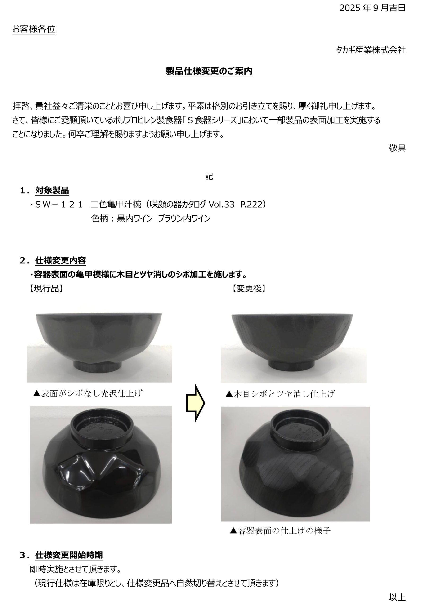 仕様変更のお知らせ【SW121_S食器シボ変更】2025年09月