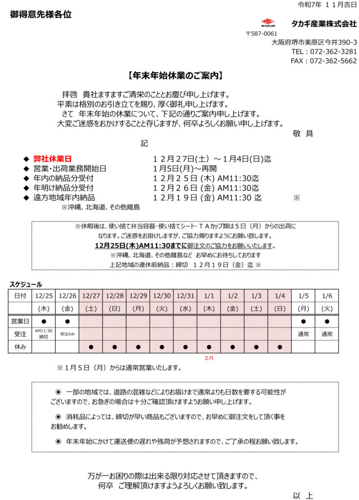 尚、年末年始は道路の混雑や荷物に集中により配送日に乱れが生じる可能性がございます。